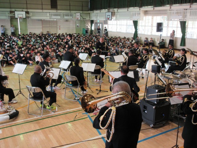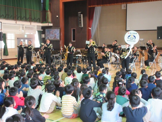 今日は、海上自衛隊佐世保音楽隊の皆さんにおこしいただき、芸術鑑賞会を開きました。迫力ある演奏、楽しい演奏をたっぷり味わい、みんなで楽しく充実した時間を過ごすことができました。音楽隊の皆さんありがとうございました!