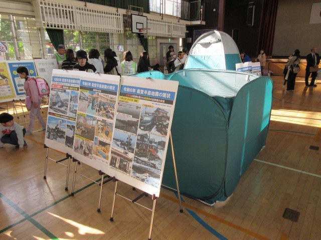 今日は、市民総ぐるみ防災訓練の日でした。学校では、避難訓練、引き渡し訓練、防災展示が行われました。また、心の教育参観と、せんだんの木学習の作品展示も行いました。防災展示では、様々な関係機関の方がたくさんの展示や体験コーナーを用意してくださり、中学生・高校生のボランティアも加わって、楽しく行われました。