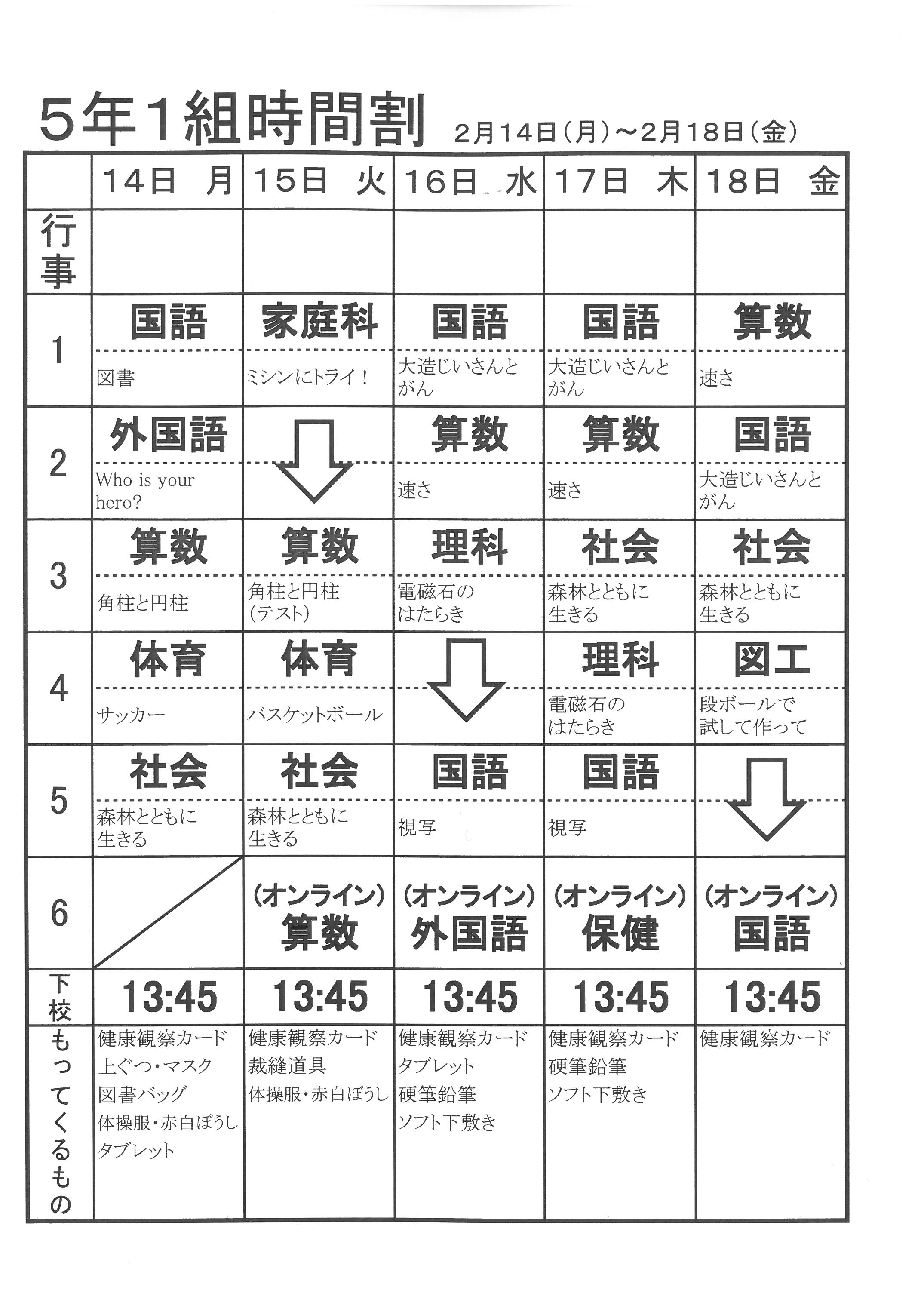 5年生時間[2/14(月)〜2/18(金)] 公開日 2022/02/10 更新日 2022/02/10 5年生 5の1 時間割→5年1組 お便り 5の2 時間割→5年2組 お便り 2/14(月)〜18(金)の時間割を掲載しています。