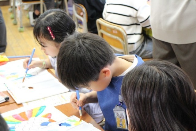 2年生が、初めての絵の具にわくわくしながら🐟の絵に色をぬりました。パレットに広がるカラフルな色を見て「どれにしようかな?」と目を輝かせる子どもたち😊筆を動かす手はとっても真剣👀✨ぬるたびに魚たちが生き...