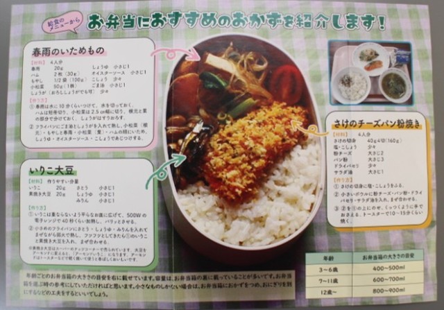 大野城市学校給食会・栄養士部会が発行したパンフレットには、子どもでも作りやすいおすすめのおかずや、きれいに詰めるコツなどが紹介されています。さらに、本校の給食委員会の子どもたちが考えたおすすめレシピも配布しています!子どもたちの視点で工夫された内容になっており、ぜひご家庭でもご覧いただき、お弁当づくりの参考にしていただければと思います。