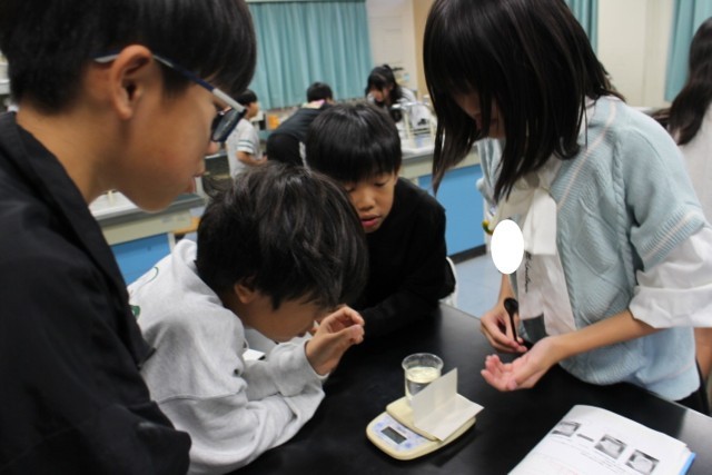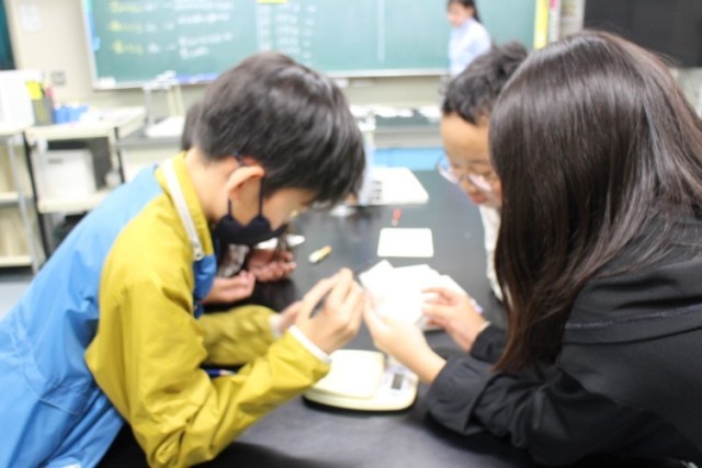 5年生理科の学習で「ものの溶け方」について調べる実験を行いました。今回のテーマは、「水に食塩を溶かしたとき、水溶液の重さはどうなるのか」です。子どもたちはまず予想を立て、「溶かす前と後で重さは変わるのかな?」と考えました。その後、電子天びんを使って、食塩を溶かす前の全体の重さと、溶かした後の全体の重さを比べる実験をしました。実験を通して、食塩が水に溶けても重さは変わらないことを確かめることができました。子どもたちは、条件をそろえて調べることや、正確に測定することの大切さを実感しながら、科学的に考える力を育んでいます。