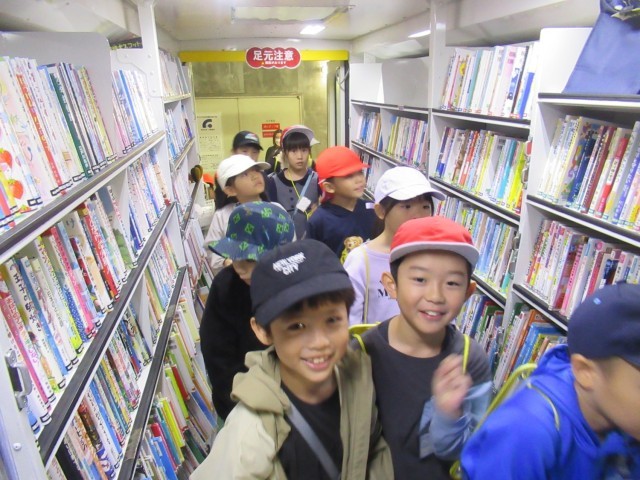 生活科の学習「まちたんけん」で、2年生が大野城まどかぴあ図書館へ見学に行きました。今回は特別に、普段は入ることができない「図書館の裏側」まで案内していただきました。 子どもたちが一番驚いたのは、たくさんの本がしまってある大きなハンドルの付いた書庫です。ハンドルを回して棚を動かす様子や、想像以上にたくさんの本が保管されている光景に、みんな興味津々でした。また、大野ジョーくんのイラストが描かれた移動図書館「わくわく号」も見せていただきました。地域の色々な場所へ本を届ける大切な車であることを学びました。まどかぴあ図書館の本は、実は学校の図書室にも貸し出されており、子どもたちにとってとても身近な存在です。 今回の探検で図書館のヒミツや工夫をたくさん発見した子どもたち。これをきっかけに、もっともっと本が大好きな「読書家」になってほしいと願っています。丁寧に案内してくださったまどかぴあ図書館の皆様、貴重な体験をありがとうございました。