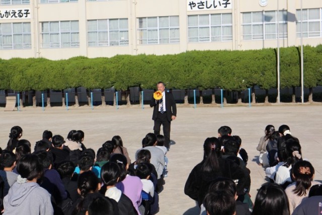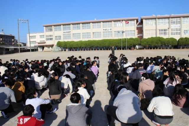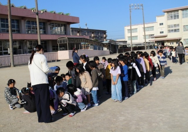 11月29日(土)大野城市総ぐるみ防災訓練の実施に合わせ、本校でも避難訓練を行いました。 市の緊急地震速報を受け、まずはその場で「シェイクアウト訓練(姿勢を低くし、頭を守り、動かない)」を行い、机の下で身の安全を確保しました。その後、揺れが収まったことを想定し、運動場へと避難しました。子どもたちは避難の約束である「お・は・し・も(おさない、はしらない、しゃべらない、もどらない)」をしっかりと守り、全員が真剣な表情で素早く避難することができました。今後も「自分の命は自分で守る」を合言葉に、日頃から防災に対する意識を高めていきたいと思います。