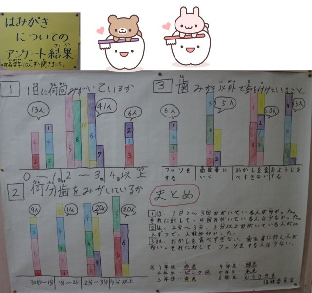 保健室前の掲示板に、保健委員会の子どもたちが作った楽しい掲示が並びました。5年生は「はみがき」について、6年生は「すいみん」について調べ、クイズやアンケートを取り入れながら、わかりやすくまとめています。見ているだけで健康への意識が高まる内容です。さらに、となりには先生が作った「かぜ予防」の掲示もあり、学校全体で健康づくりに取り組んでいます。子どもたちが主体的に考え、工夫して作った掲示は、学校の温かい雰囲気を感じさせてくれます。ぜひご覧ください!