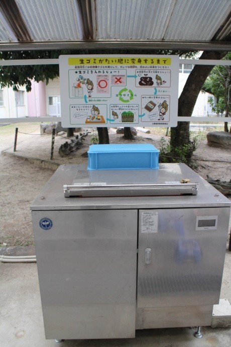 中庭にある 給食用ごみ処理機 に、新しく 『大野ジョーくん』の説明看板 がつきました✨