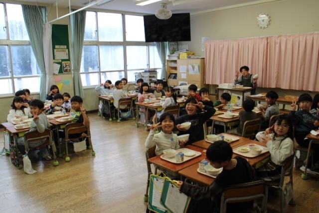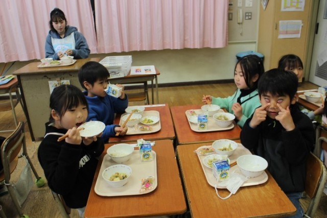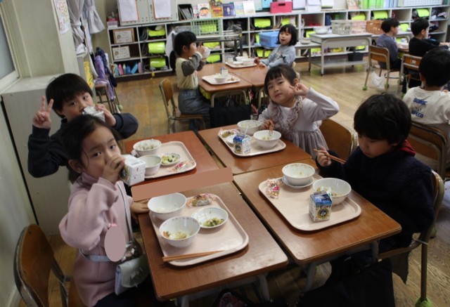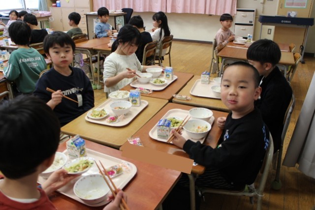 1年生の教室をのぞくと、「おいしいね!」「あったかい!」「おかわり!」と、にこにこ笑顔で給食を味わう姿がいっぱい✨