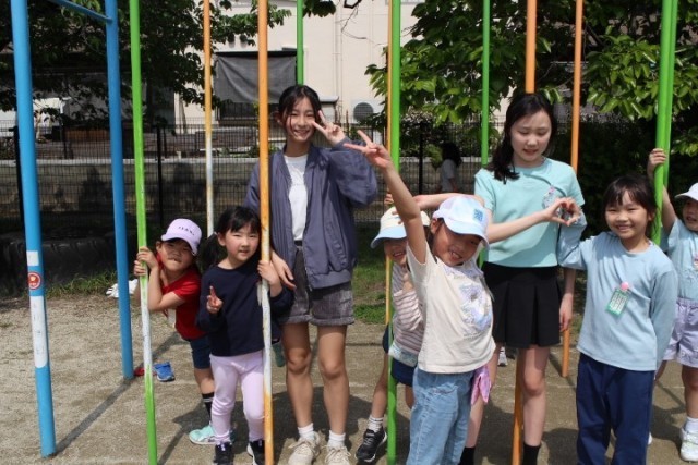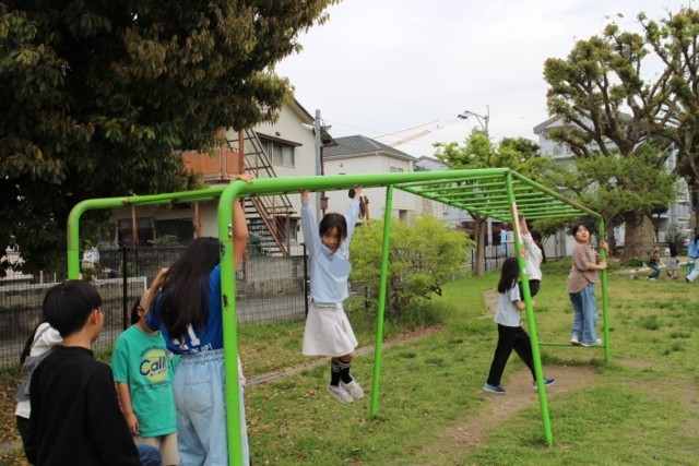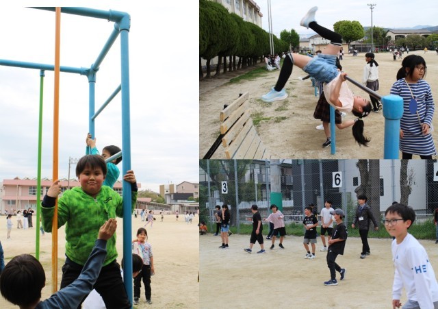 広い運動場では、新1年生もすっかり学校生活に慣れ、鉄棒や上り棒、雲梯、ジャングルジムなどの遊具に挑戦しながら、友だちと笑顔いっぱいで遊んでいます🤸♂️✨