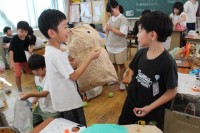 2年生が図工の授業で、大きな紙袋をくしゃくしゃにしたり、ぎゅっと丸めたりしながら...