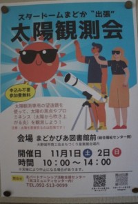 理科室の前に「太陽観測会」のポスターが貼ってありました。まどかぴあ図書館前で、11月1日(土)・2日(日)10:00~14:00に太陽観測専用の望遠鏡を使って、太陽の黒点や炎(プ...