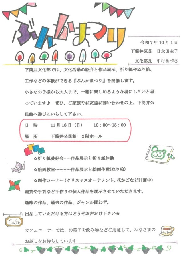 11月16日(日)、下筒井公民館にて「ぶんかまつり」が開催されます。時間は10:00〜15:00です。会場では、地域の皆さんの作品展示のほか、折り紙教室・絵画教室・クリスマスのオ...