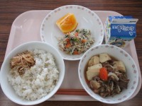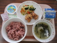 ★赤飯 ★牛乳 ★唐揚げ ★小松菜のアーモンド和え ★お吸い物 ★すだちゼリー ...
