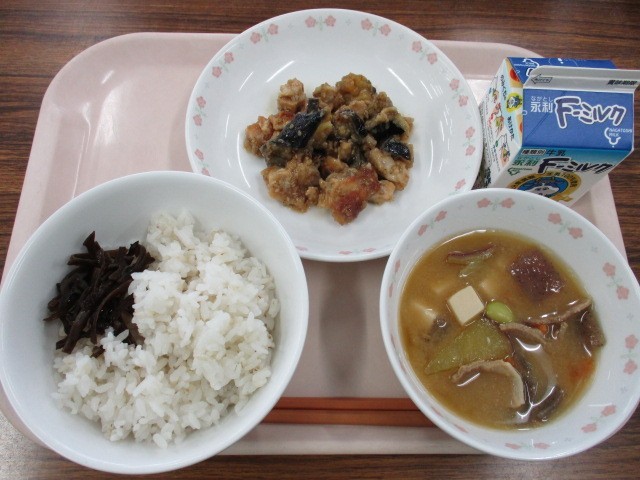 ★麦ご飯 ★鶏肉と茄子(なす)の揚げ煮 ★秋野菜の豚汁 ★きくらげの佃煮