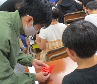 6年生が1年生に折り鶴の折り方を教えています。平和への願いを込めて全校児童で折った折り鶴は、6年生が修学旅行の際に訪れる原爆落下中心地で奉納する予定です。