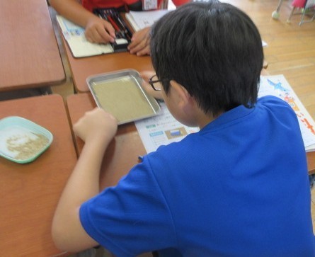 4年生は理科の学習で雨水の行方について学んでいます。水のしみこみ方について学ぶ学習では、学校内の二ヵ所の土や砂に触れて粒の大きさの違いを実感した上で、実際に水のしみこむ速さを比べる実験を行い、学びを深めています。