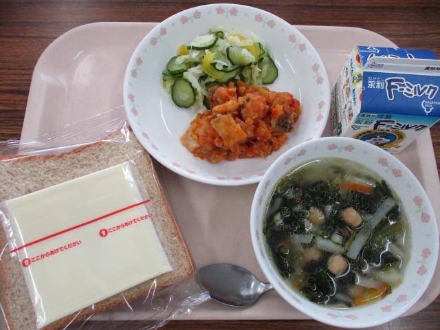 ★胚芽食パン ★牛乳 ★スライスチーズ ★白身魚のトマトソース ★サラダ・バラディ ★モロヘイヤとひよこ豆のスープ