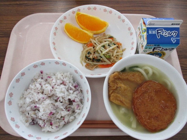 ★しそ麦ご飯 ★丸天うどん または きつねうどん ★ツナともやしのごま炒め ★オレンジ