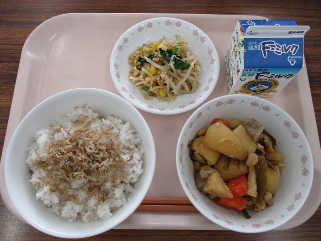 ★麦ごはん ★牛乳 ★磯煮 ★もやしのナッツ和え ★じゃこふりかけ
