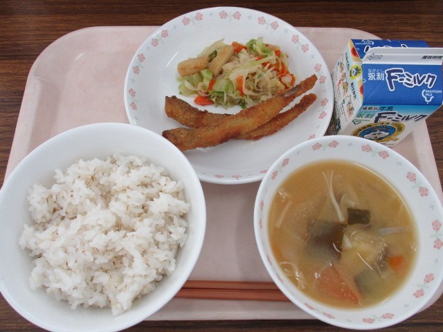 ★麦ごはん ★牛乳 ★ししゃもフライ ★切干大根の炒め物 ★きのこたっぷり味噌汁