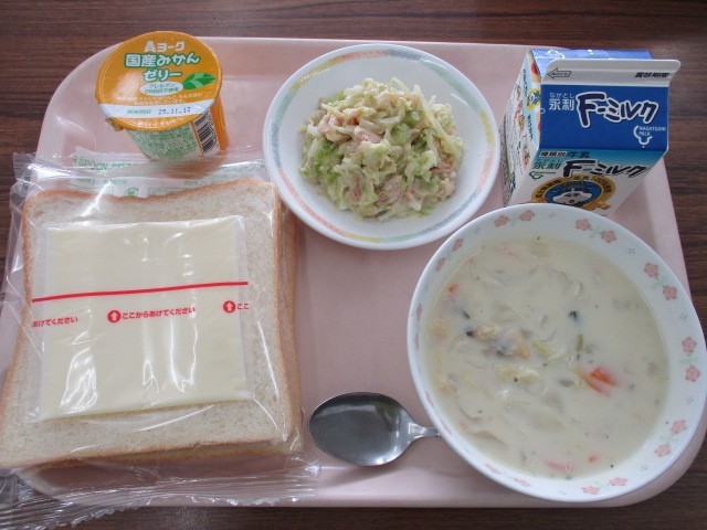 ★チーズサンド(パン スライスチーズ ツナサラダ) ★クラムチャイダー ★みかんゼリー
