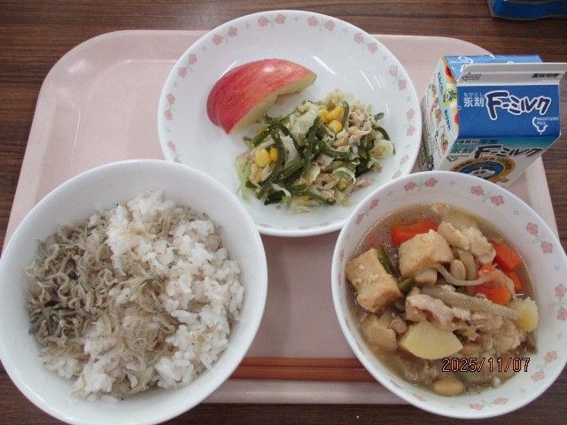 11月8日はいい歯の日です。よくかむことは、歯のためにも大切です。7日の給食には、ごぼう、こんにゃく、しらずぼし、りんごなど、かみごたえのある食材がたくさん使われています。