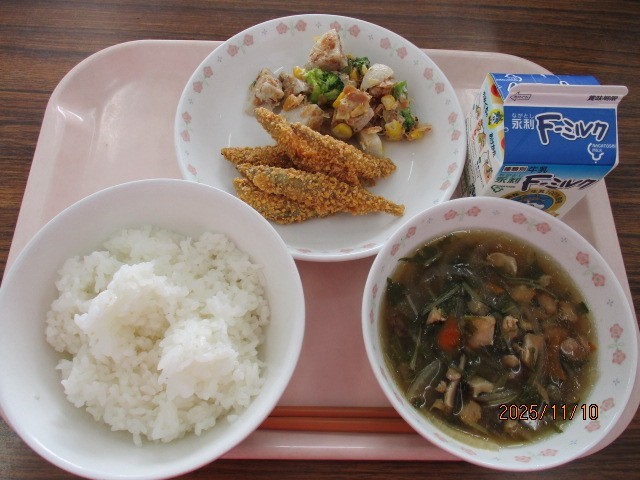 ★大野城鶏ぼっかけ(ごはん) ★牛乳 ★きびなごカリカリフライ ★里芋とアーモンドのサラダ