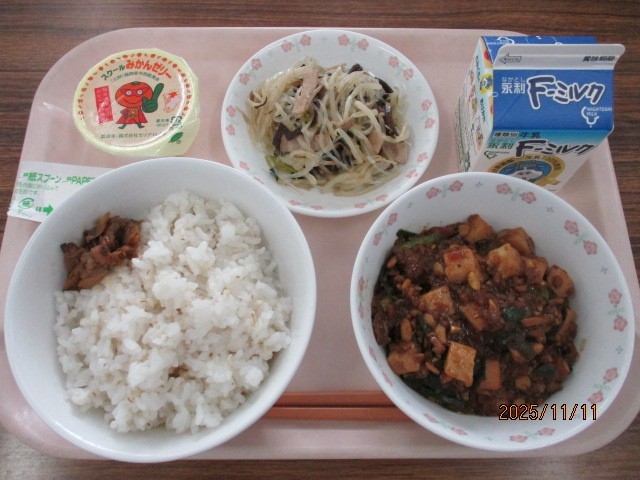 ★麦ごはん ★牛乳 ★麻婆豆腐 ★春雨の炒め物 ★あさりの佃煮 ★みかんゼリー