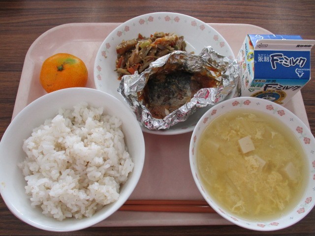★麦ご飯 ★牛乳 ★鯖のホイル焼き ★きんぴらごぼう ★かきたま汁 ★みかん