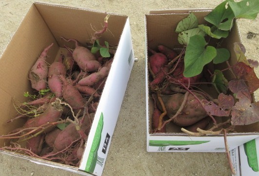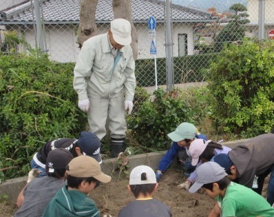 17日(月)1年生が芋掘りをしました。苗植えや草取り等でもお世話になっている地域の方々と一緒に、成長したサツマイモを掘り出しました。土の中で成長したお芋に、子供たちは大喜びでした。