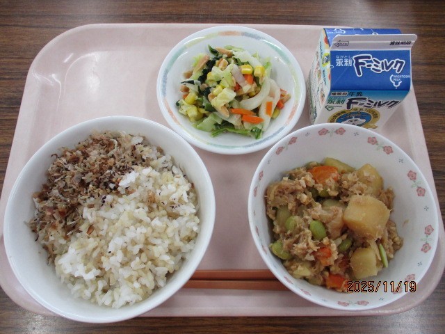 ★玄米ご飯 ★牛乳 ★ツナじゃが ★ナッツ炒め ★ゆかりふりかけ