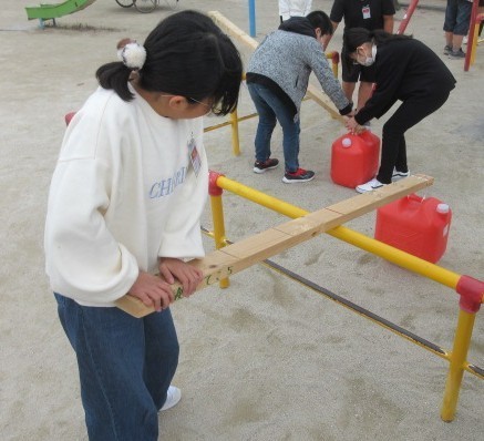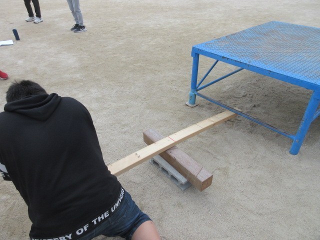6年生は、理科「てこのはたらき」の学習で、てこの原理を利用した実験を通して、力を加える位置や力の大きさの違いによるてこのはたらきの変化を実感的に学んでいます。