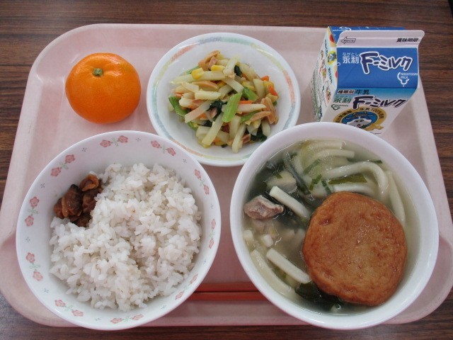 ★麦ご飯 ★牛乳 ★丸天うどん ★ナッツ炒め ★あさりに佃煮 ★みかん
