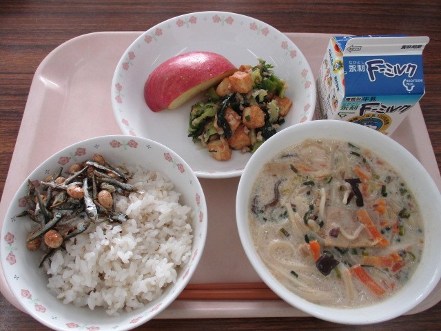 ★麦ご飯 ★牛乳 ★ごま味噌ラーメン ★厚揚げの炒め物 ★いりこ大豆 ★りんご