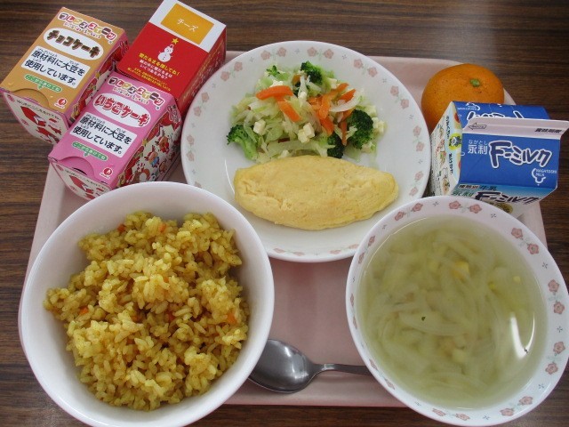 ★カレーピラフ ★牛乳 ★トマトオムレツ ★星のチーズサラダ ★じゃがいもと豆のスープ ★デザート(チョコケーキ いちごケーキ レアチーズケーキ みかん)