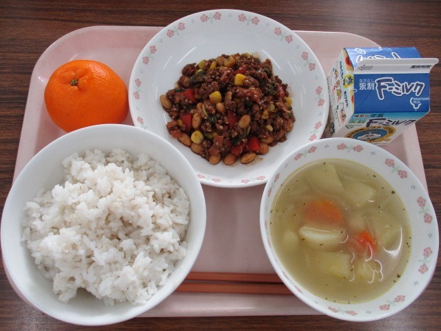 ★コロコロ野菜のみそバター丼(麦ご飯) ★牛乳 ★ジャガイモのスープ ★ぽんかん
