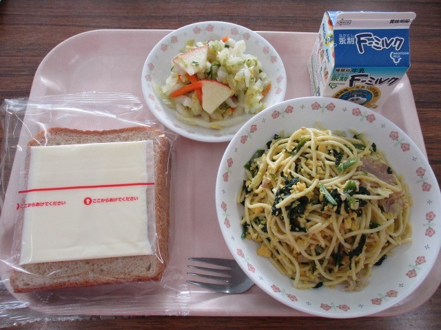 ★胚芽食パン ★牛乳 ★スライスチーズ ★ほうれん草のオイルパスタ ★白菜とりんごのサラダ