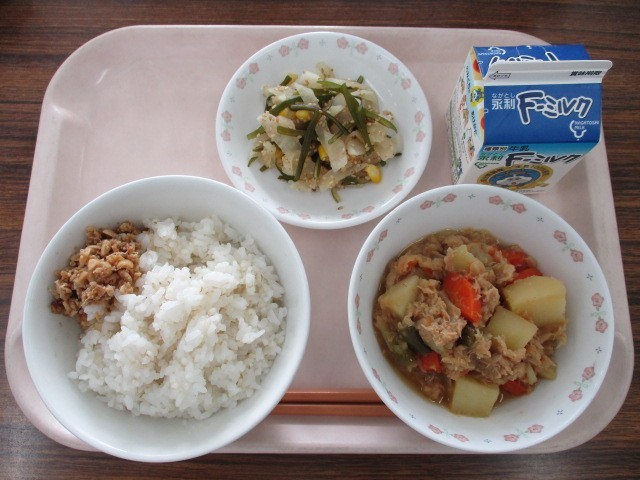 ★麦ご飯 ★牛乳 ★ツナじゃが ★茎わかめのサラダ ★そぼろふりかけ