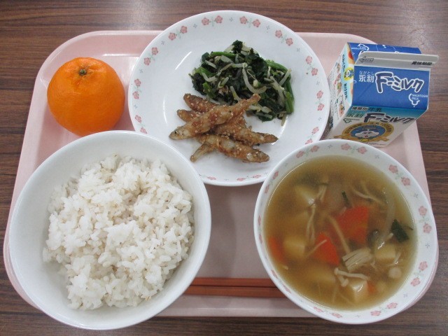 ★麦ご飯 ★わかさぎの揚げ煮 ★ほうれん草とのりの香り和え ★肉団子汁 ★ぽんかん