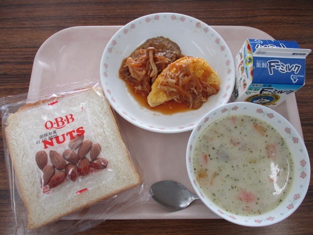 ★減塩食パン ★牛乳 ★ハンバーグまたはオムレツのデミソースがけ ★豆乳クラムチャウダー ★アーモンド