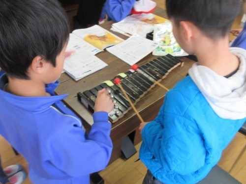 2年生は、すずやカスタネット、木琴などの楽器を使って演奏を楽しんでいます。