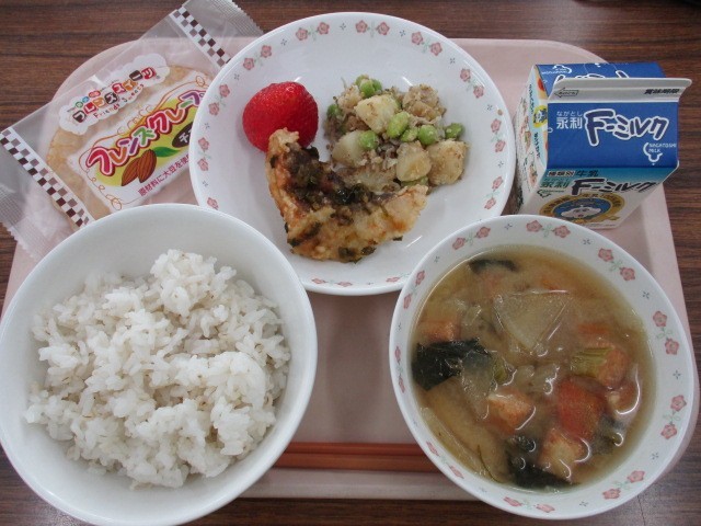 ★麦ご飯 ★牛乳 ★白身魚のねぎソース ★じゃがじゃこ ★いちご または チョコクレープ