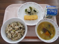 ★五目ごはん ★牛乳 ★厚焼き卵 ★大根とわかめの酢の物 ★栄養みそ汁 【大正時...