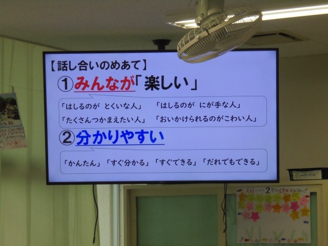 クラスの運動会『スイミー運動会」で取り組む遊びのルールを決める話合い活動でした。
