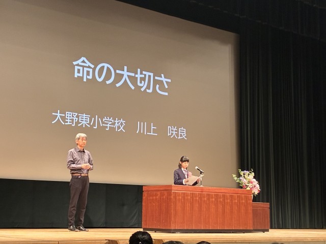 1日の小中学生意見発表では、6年生の川上さんが学校の代表として堂々とまどかピアの大ホールで「命の大切さ」と題し、平和を守るために自分にできることや、自分の夢について発表することができました。実に素晴らしい、意見発表でした。