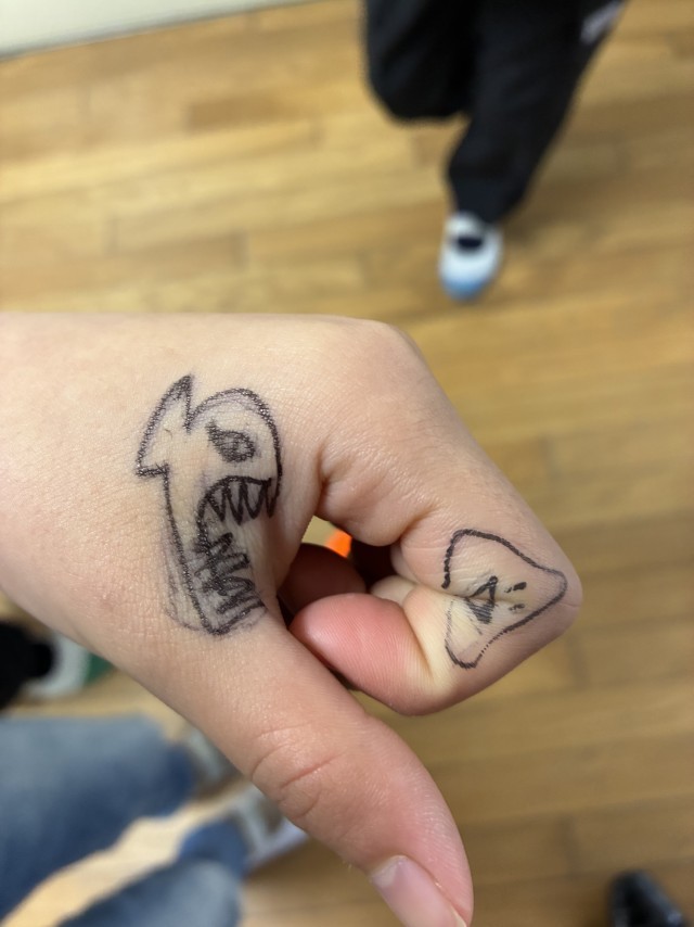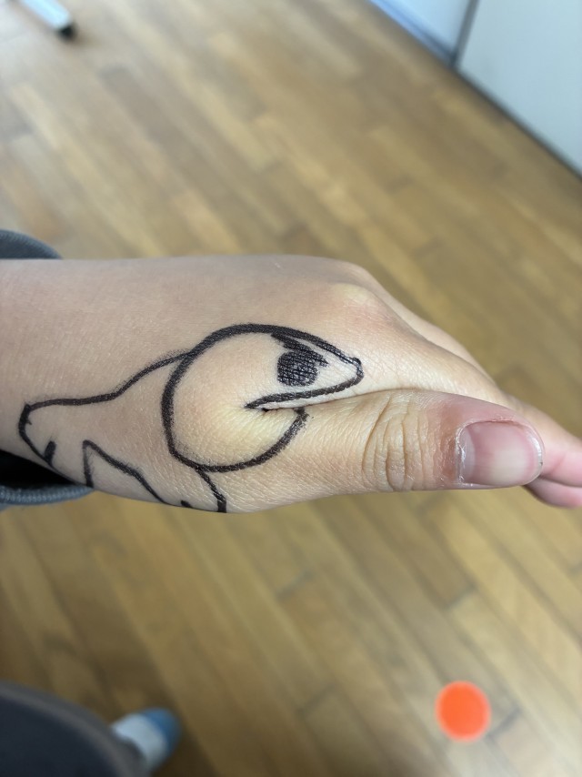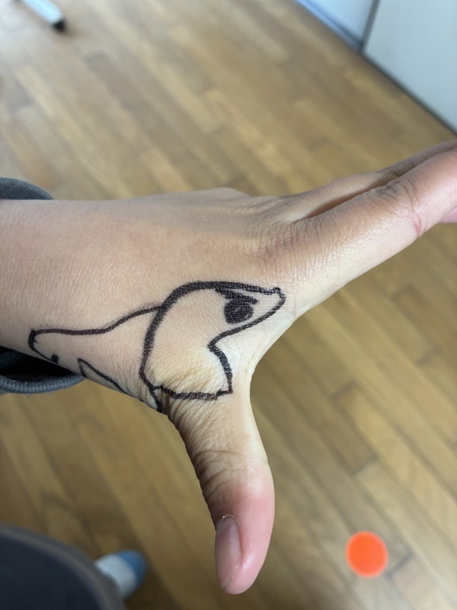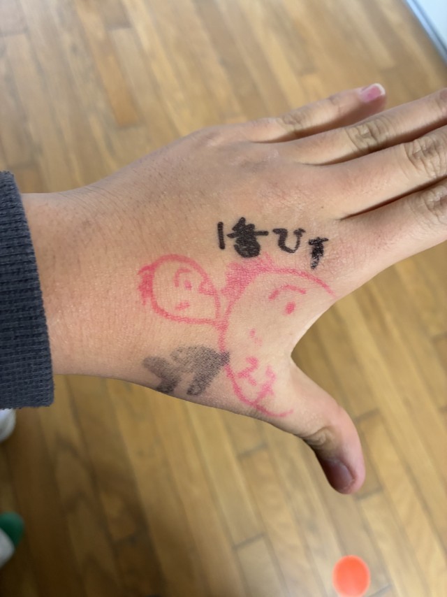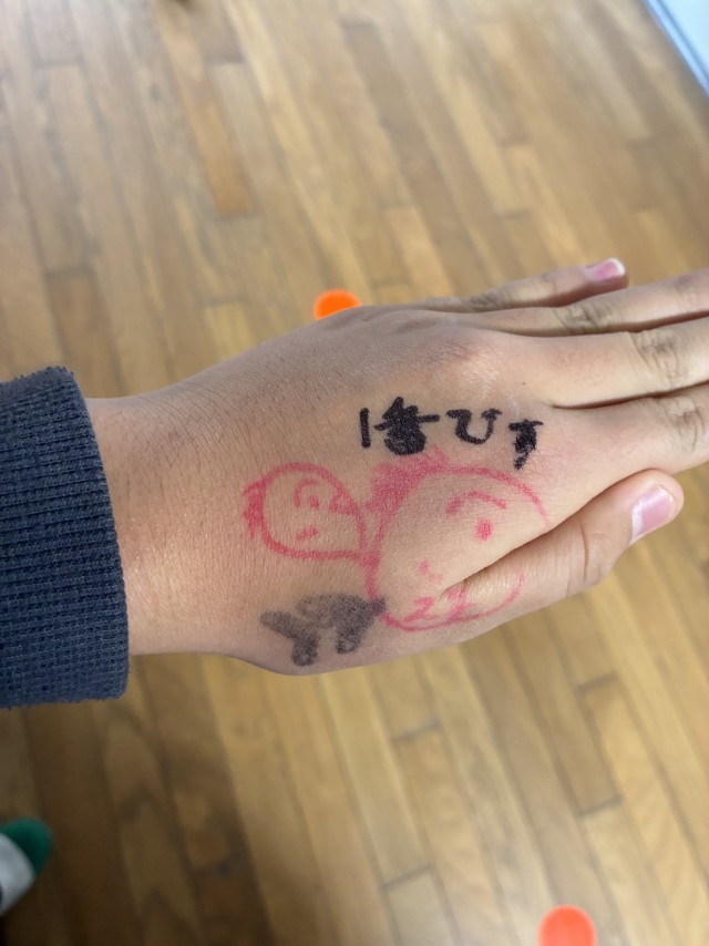 「校長先生,見て!見て!」休み時間に四年生の女の子が私のところへ来て、手に描いた魚?を見せてくれました。「いい?行くよ」閉じていた手を開くと、魚が大きく口を開けます。「えー!おもしろい!よく思いついたね。」子どもの発想は楽しいですね。自分の手で遊べるなんて。「考えついたのは、同じクラスのこの子だよ!」考え出したお友達を嬉しそうに紹介しに再び校長室に3人で来てくれました。子どもとふれあえる時間が一番の癒しですね。子どもがいつでも校長室に訪ねて来れるよう、今日も扉を開けて待っています。