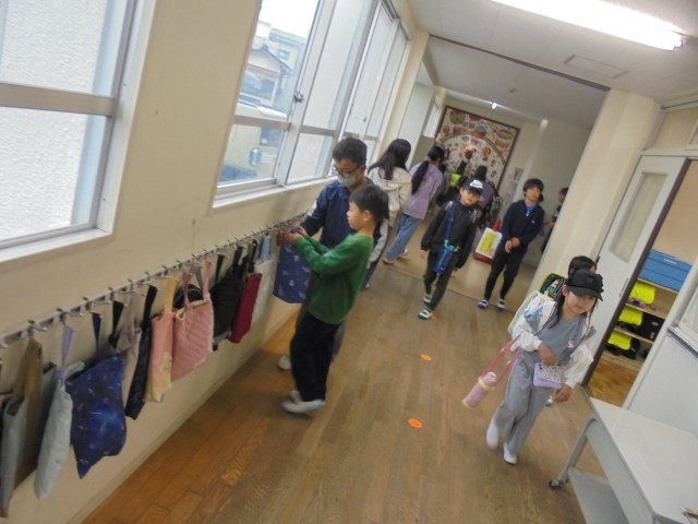 今朝の登校後、1年生が身支度をしている教室に、6年生がそっと寄り添い、ランドセルの片付けや朝の準備の仕方をやさしく教えていました。