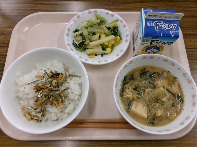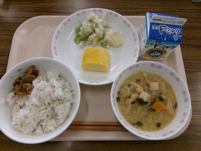 麦ごはん 牛乳 だしまき卵 じゃがじゃこ みそ汁 あさりの佃煮