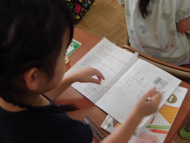 子どもたちは、担任の先生の話をしっかりと聞きながら、ノートと教科書の縦と横を比較していきました。