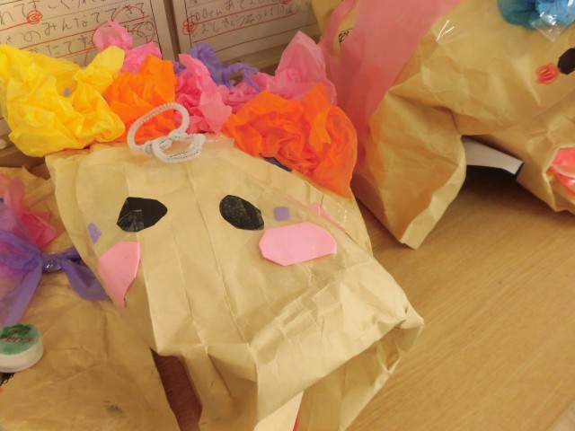 教室の後ろの棚には、かわいい作品が子どもたちを見つめています。
