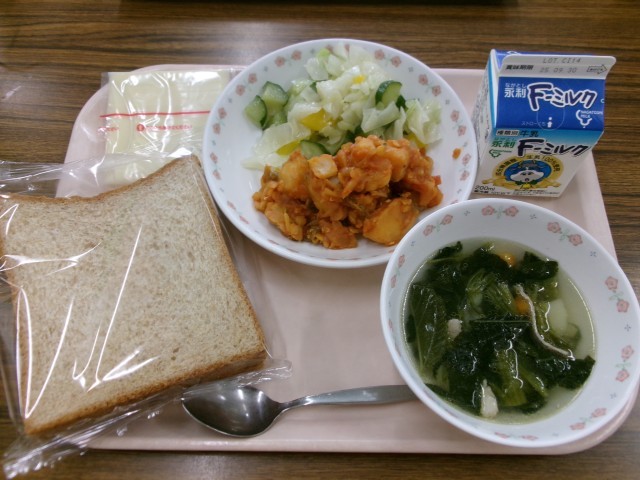 胚芽食パン 牛乳 スライスチーズ 白身魚のトマトソース サラダ・バラディ モロヘイヤとひよこ豆のスープ